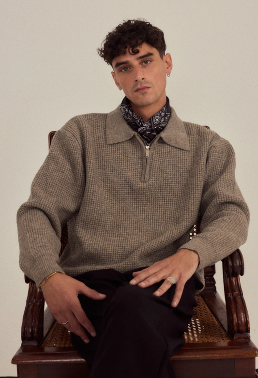 Collo Rustico Sweater — Ribgebreide herentrui met een hoge col en een rijke mélange structuur....