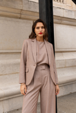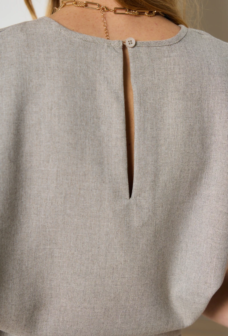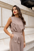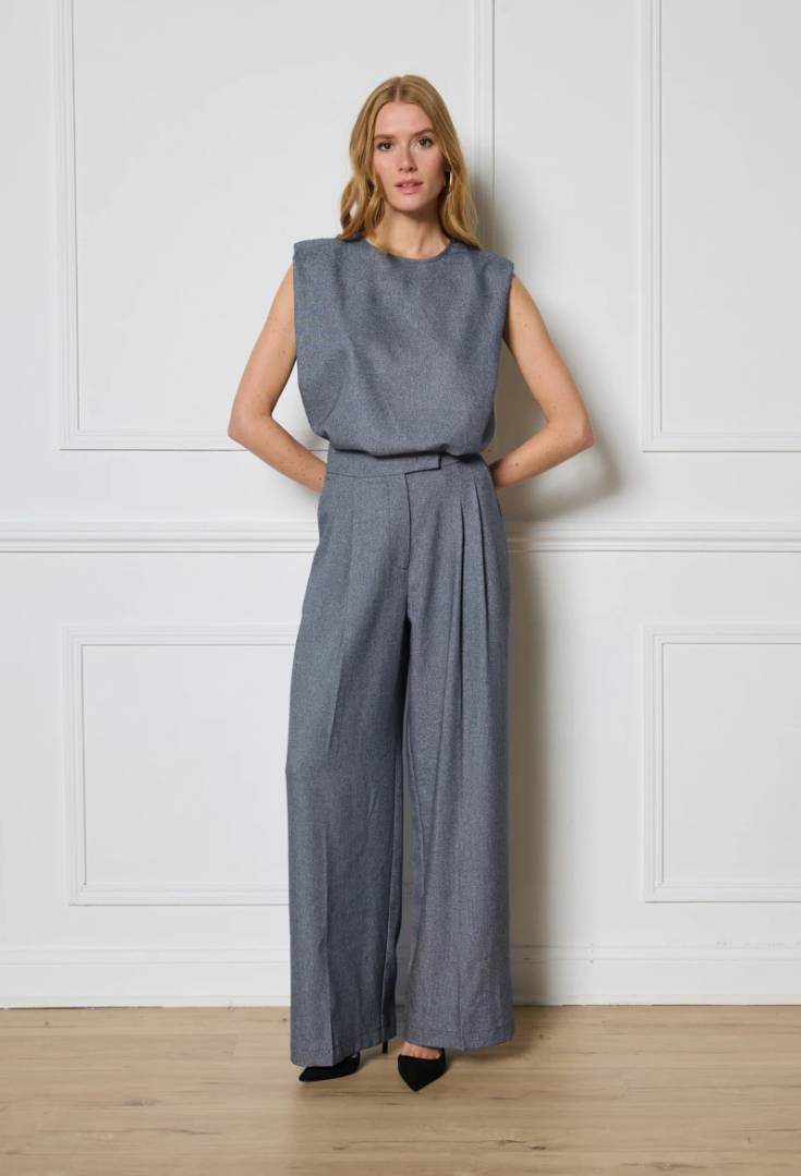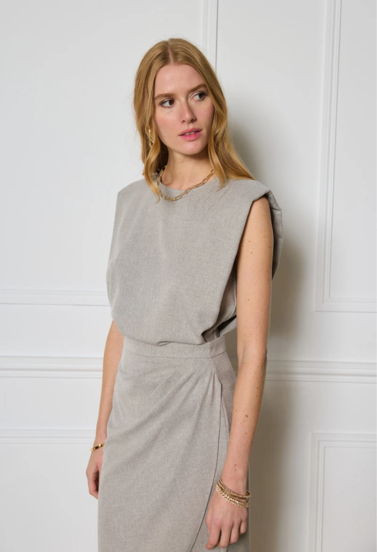 Ærmeløs tailleur-top med skulpturel skulder og ren rund hals. Den lige, let løstsiddende krop er lavet i en luftig habitstof med subtil mélange og lidt stretch: bevarer formen, føles komfortabel og er perfekt at stoppe ind i en high-waist nederdel eller bukser.
