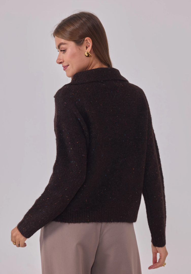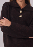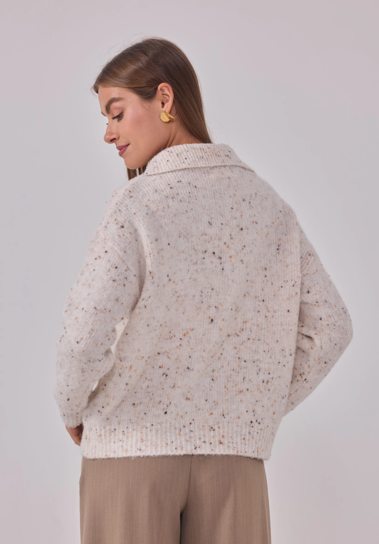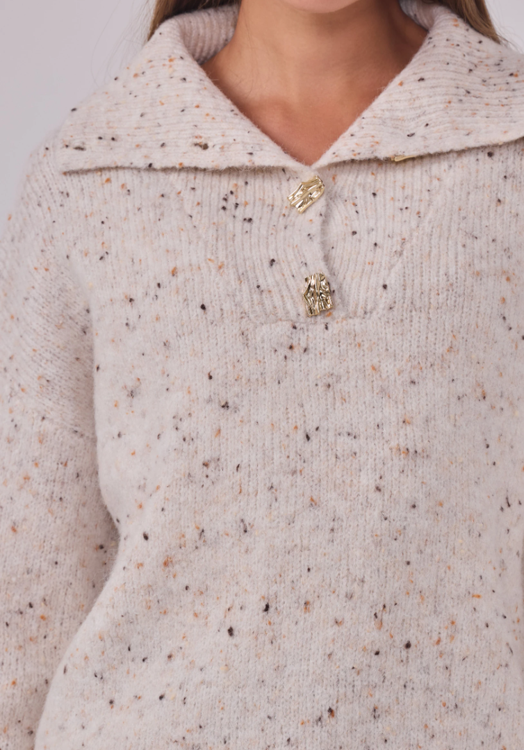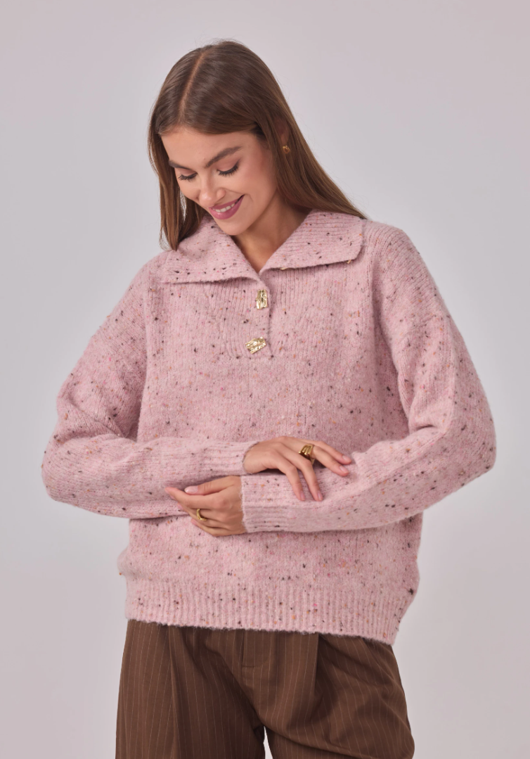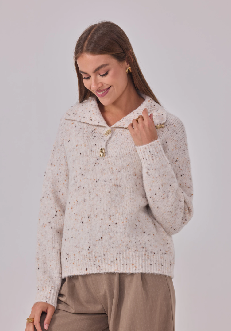Zacht, warm en een vleugje glans. Maglia Cosmo Dorato is onze speelse speckle-trui met een royale polokraag en goudkleurige, gehamerde knopen die subtiel oplichten. Een relaxed fit op heuplengte met verlaagde schouders en ribboorden—comfortabel zonder aan klasse in te boeten.