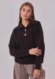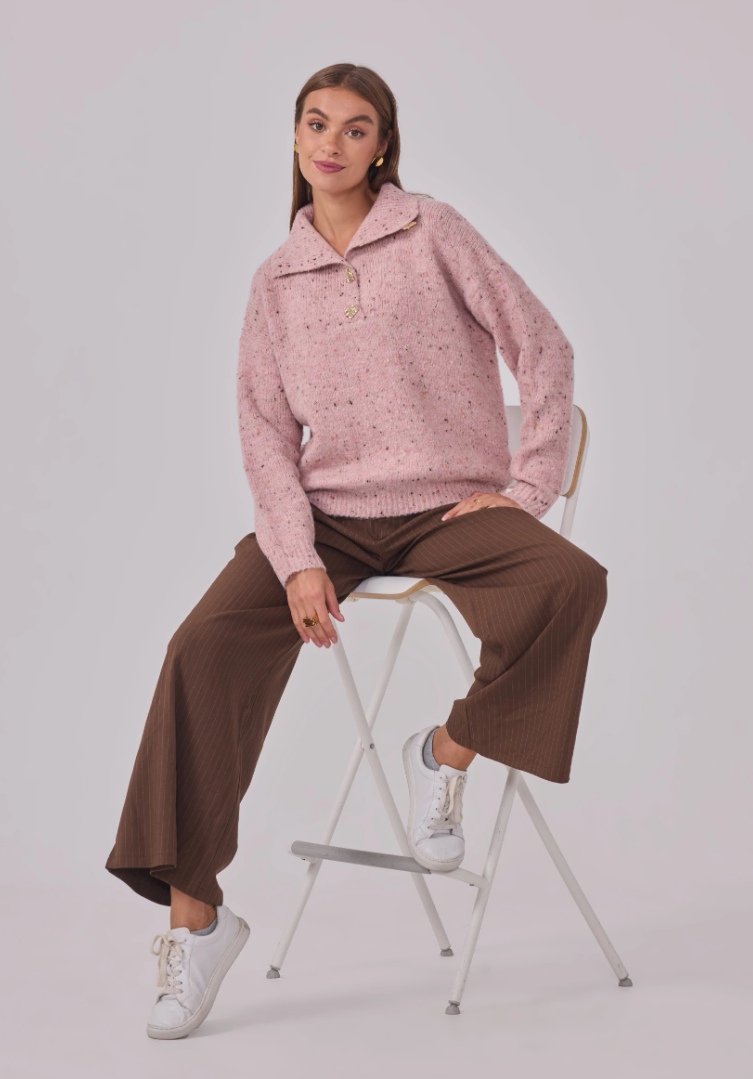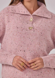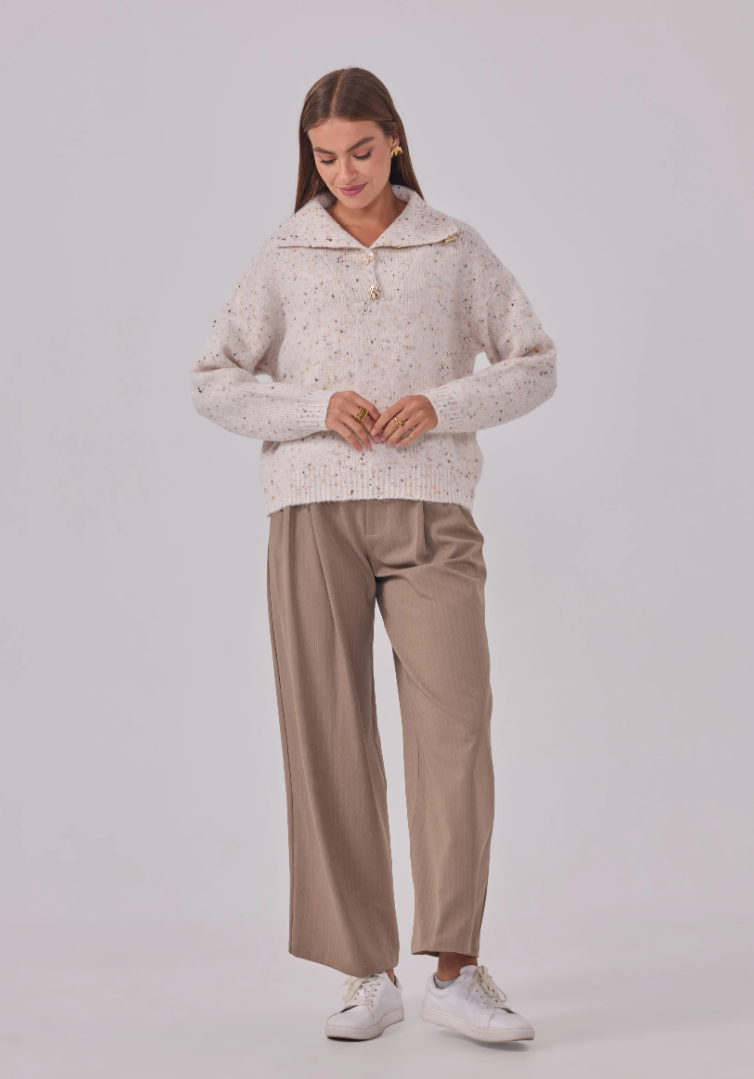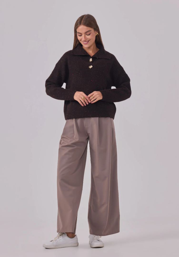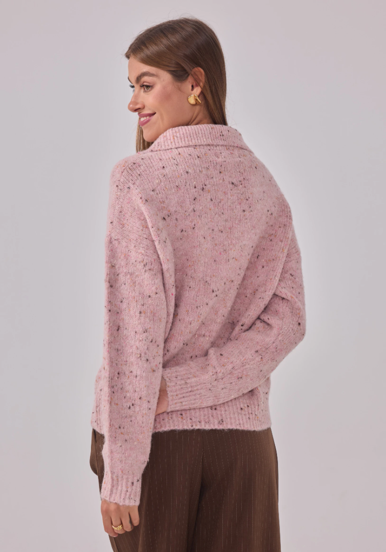 Zacht, warm en een vleugje glans. Maglia Cosmo Dorato is onze speelse speckle-trui met een royale polokraag en goudkleurige, gehamerde knopen die subtiel oplichten. Een relaxed fit op heuplengte met verlaagde schouders en ribboorden—comfortabel zonder aan klasse in te boeten.