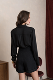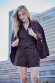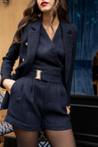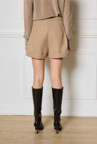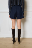 Korte, getailleerde short van luxe bouclé/tweed met een subtiele glans. De hoge taille verlengt optisch de benen; plooien voor en een omslagzoom geven ‘m die nette, Paris-chique look. Afgewerkt met een goudkleurige statement-gesp.
