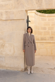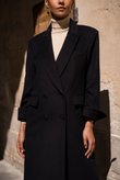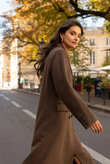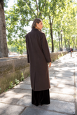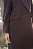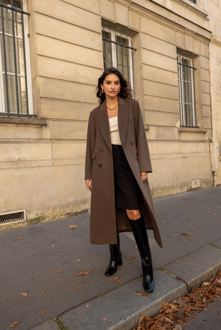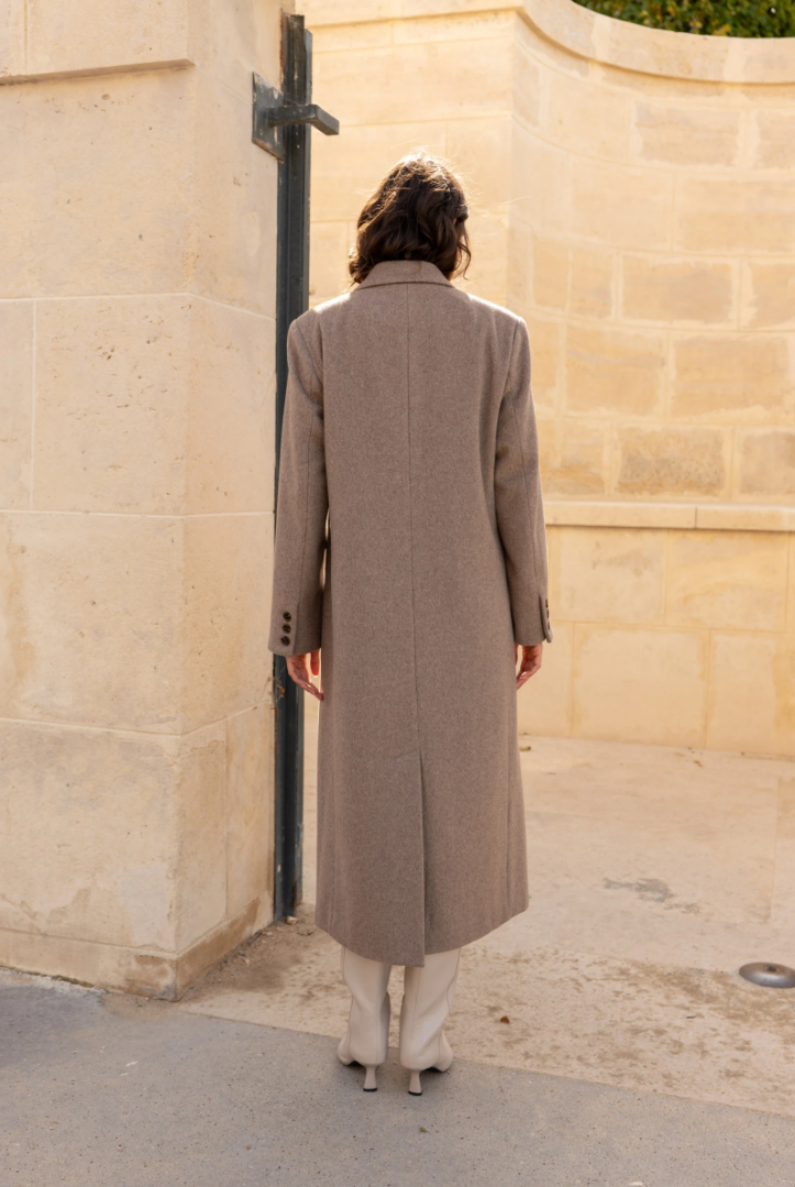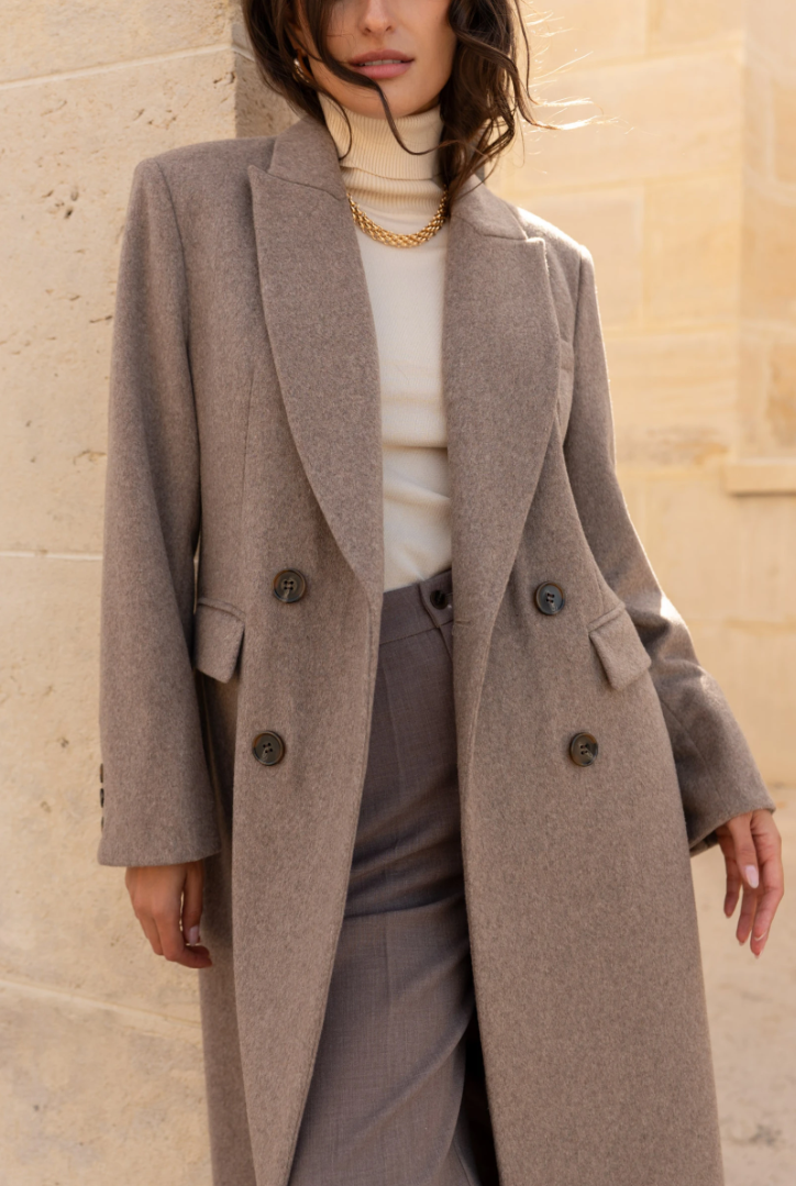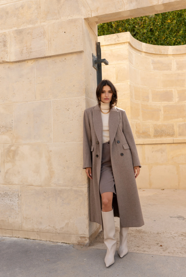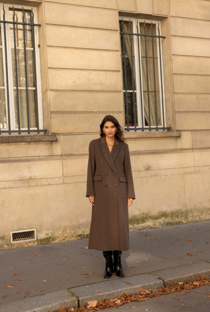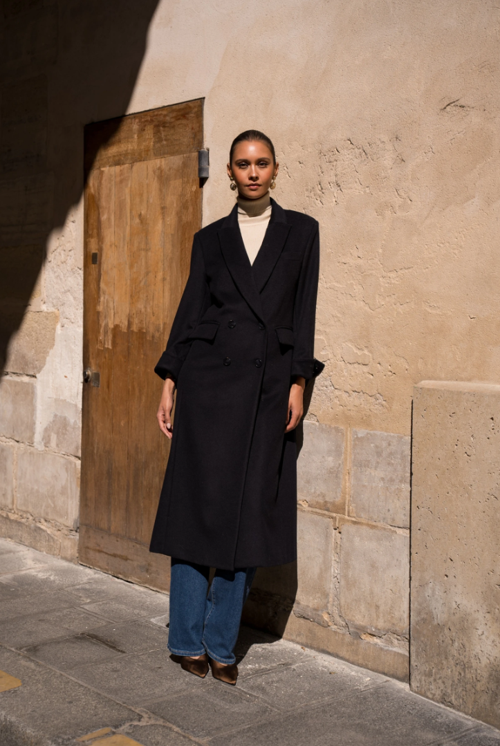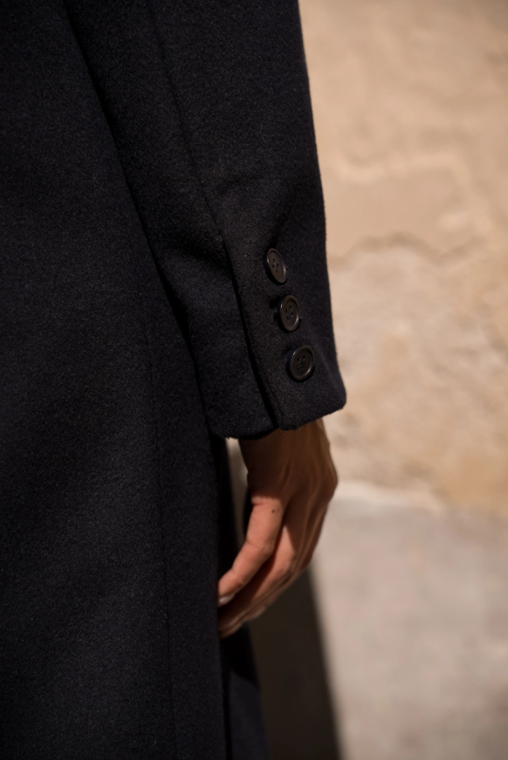 A long wool coat with a double-breasted closure, sharp architectural tailoring, and the timeless elegance of Rome.