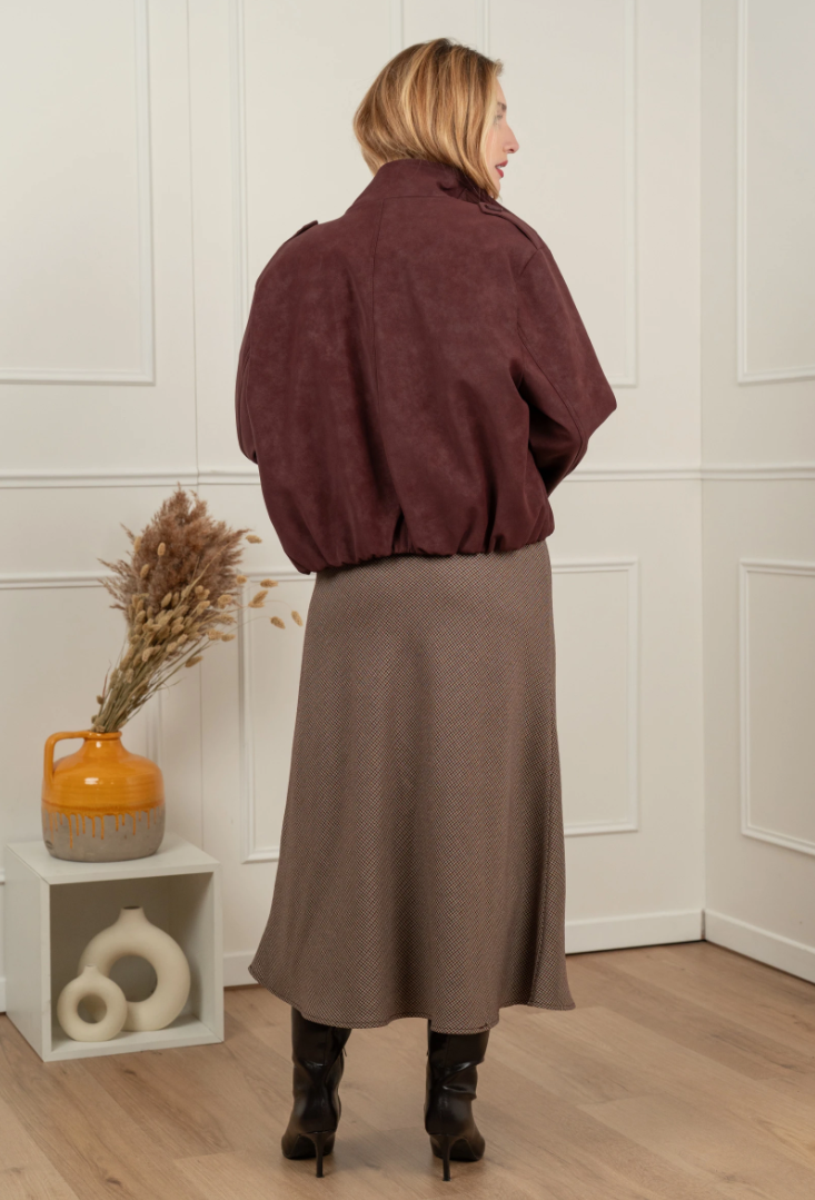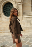 Een intens chocoladetint die de militaire lijnen extra laat spreken. Luxe, veelzijdig en perfect voor city-chic styling.