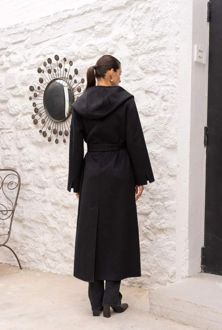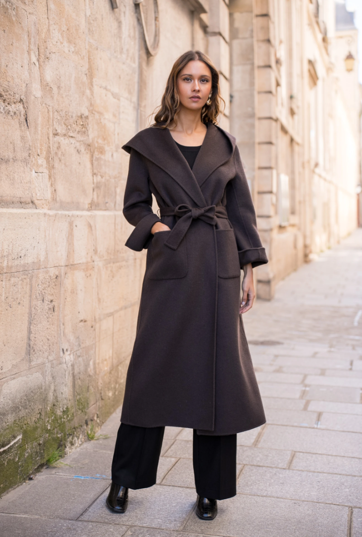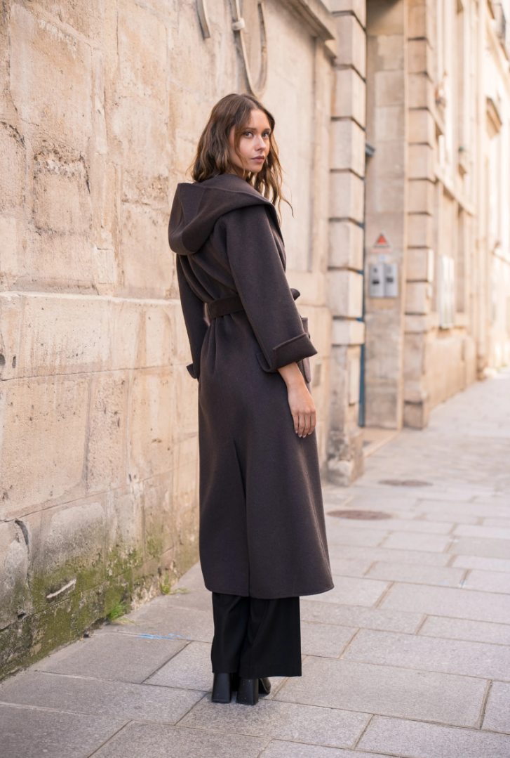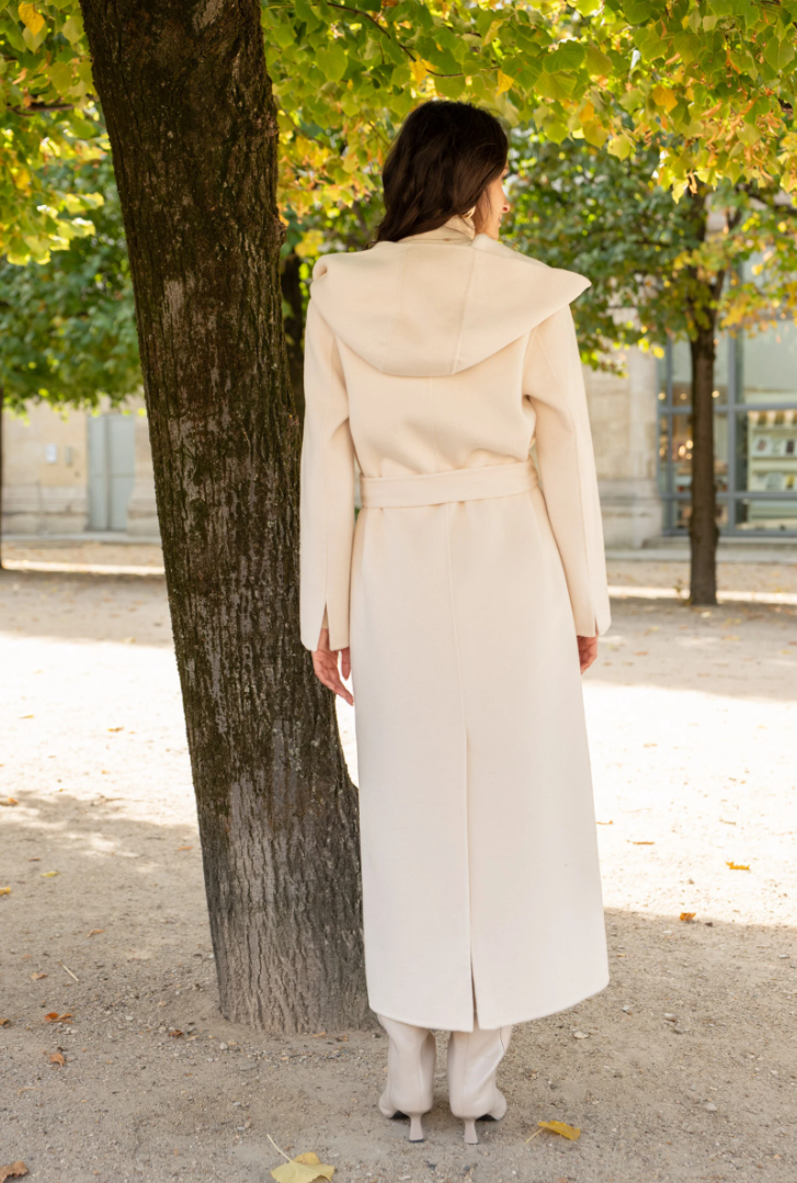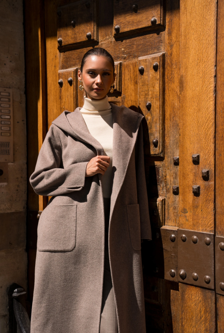 An Italian-class hooded coat — warm, feminine, and effortlessly refined. The sculpted hood opens into a soft shawl collar, while the self-tie belt subtly defines the waist. Crafted from a soft, warm winter fabric with a calm, matte finish.