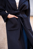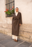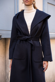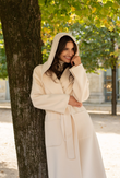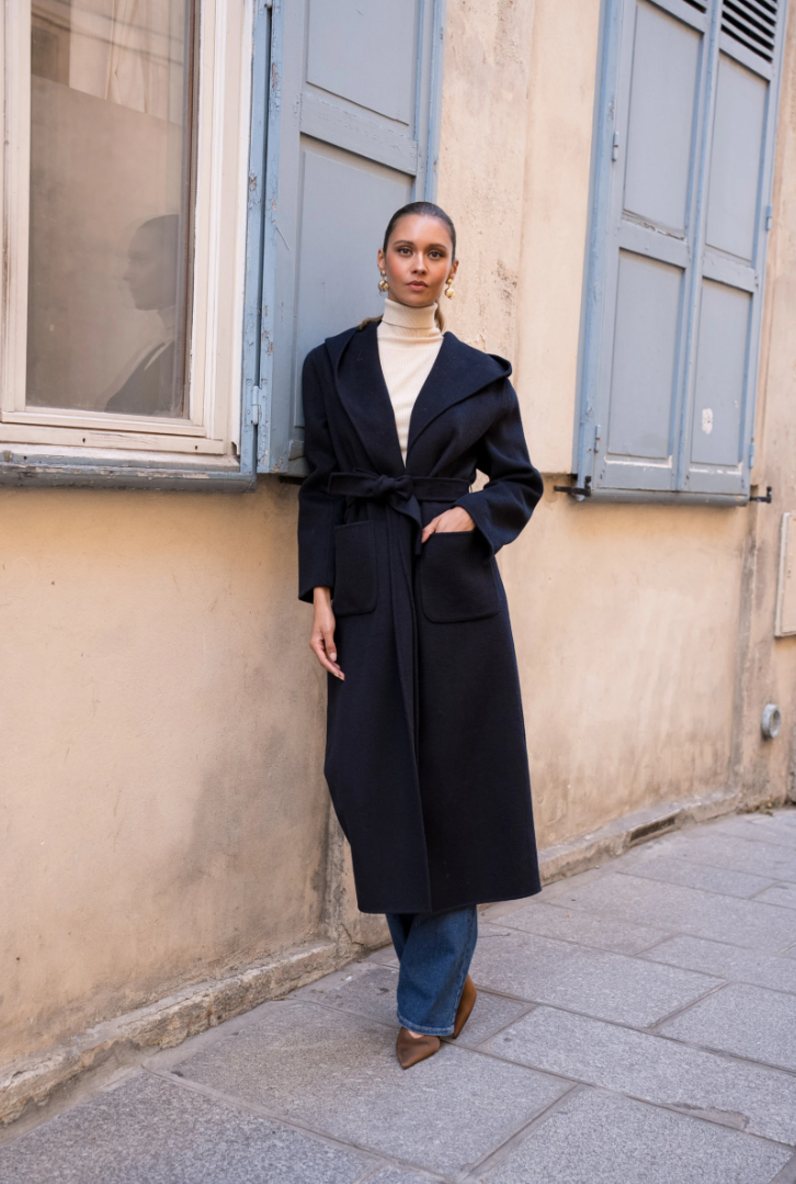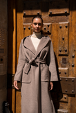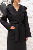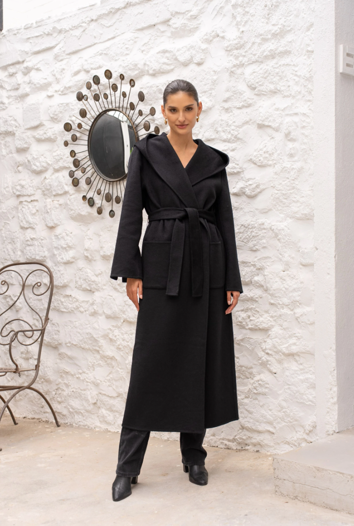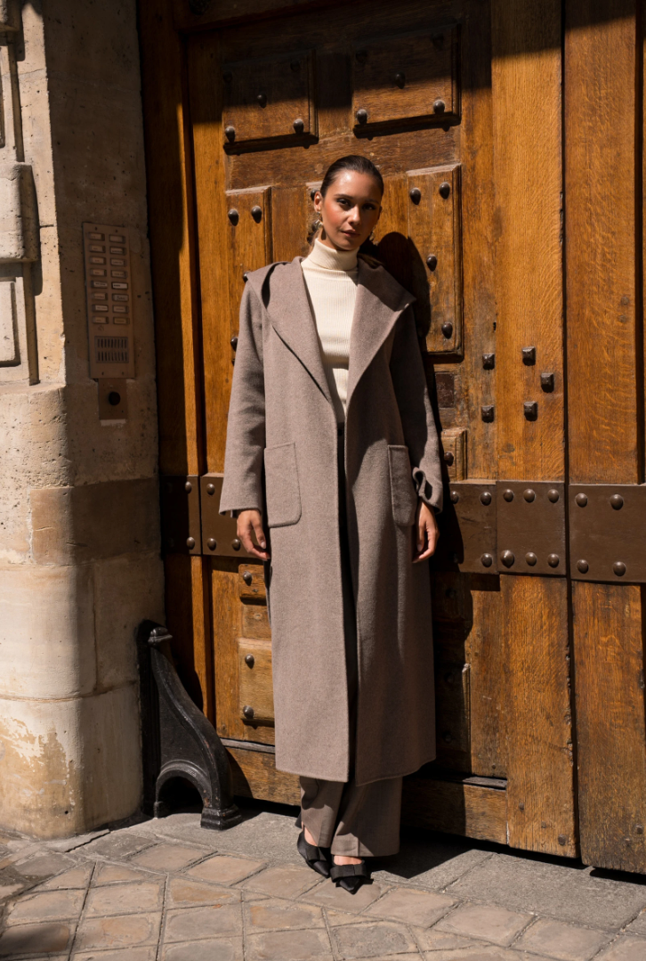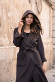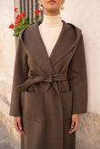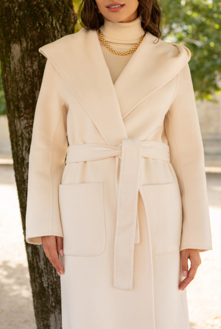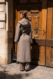 An Italian-class hooded coat — warm, feminine, and effortlessly refined. The sculpted hood opens into a soft shawl collar, while the self-tie belt subtly defines the waist. Crafted from a soft, warm winter fabric with a calm, matte finish.