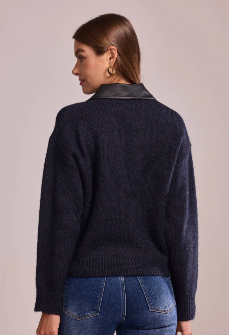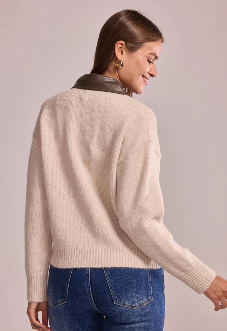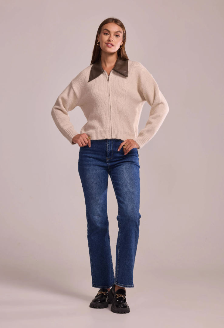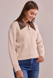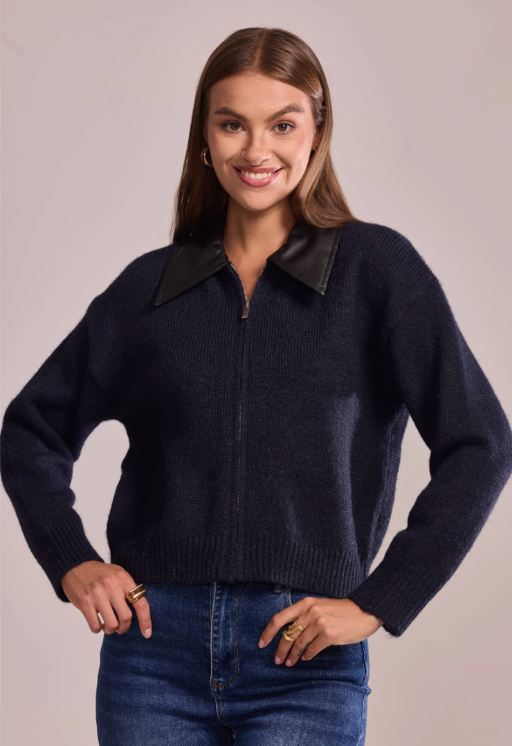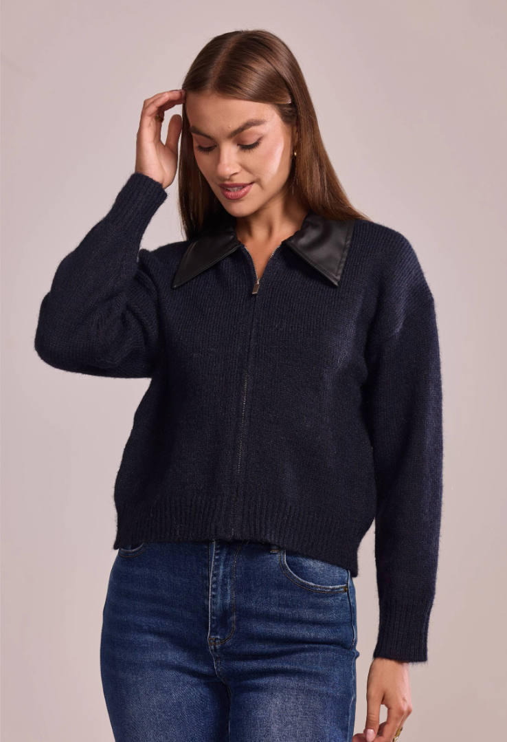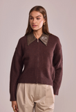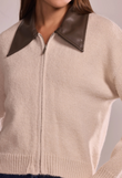 A statement knit that blends softness with sharp lines. This zip-front cardigan features a pointed faux-leather collar — the signature Lancia detail — and a relaxed, slightly cropped silhouette that pairs effortlessly with any look.