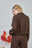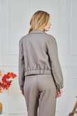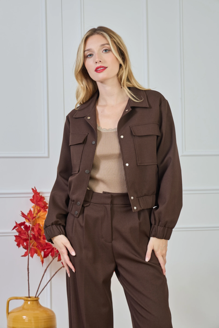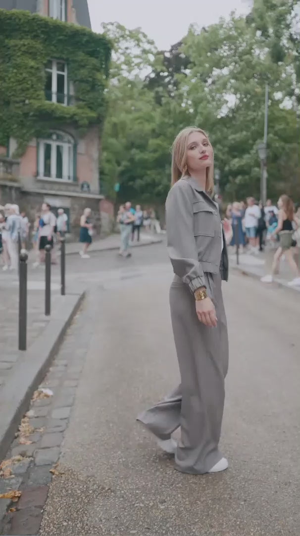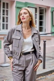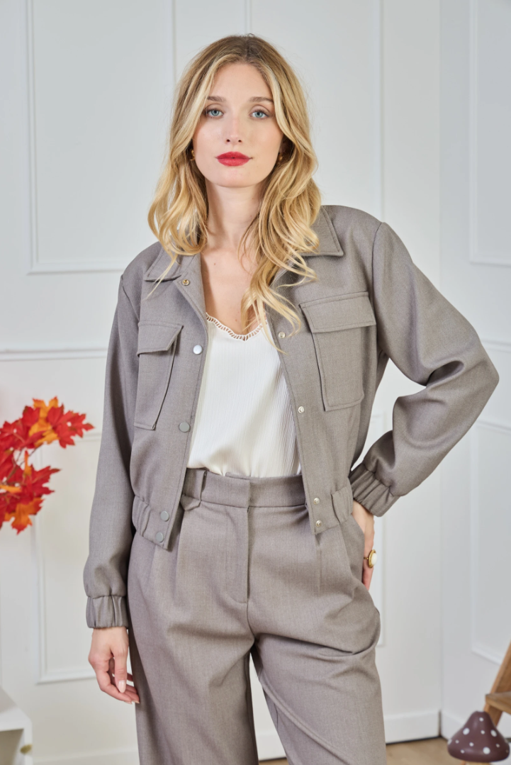 Cropped utility blazer with flap chest pockets, snap-button closure and an elasticated hem. Made from a lightweight suiting fabric with a subtle mélange and a hint of stretch — comfortable, structured, and ideal for modern city looks.