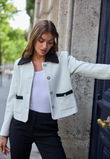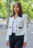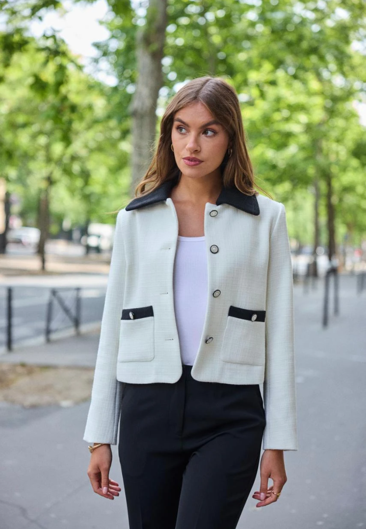 De cropped tweed-jas die Parijse elegantie met moderne scherpte combineert. De zachte écru tint vormt een luxe basis, terwijl de contrasterende zwarte kraag en zakdetails het silhouet direct structuur en klasse geven. Een tijdloze essential die moeiteloos chic oogt—van kantoor tot diner.