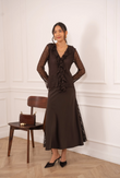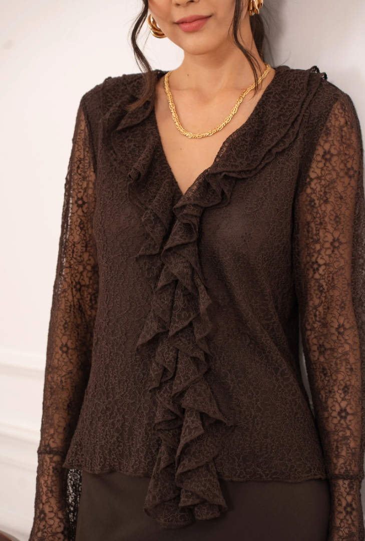 Een verfijnde blouse die vrouwelijke elegantie en subtiele allure moeiteloos combineert. Gemaakt van fijn, transparant kant met een delicate structuur die licht en soepel om het lichaam valt. De V-hals is afgewerkt met een verticale ruchestrook die het silhouet verlengt en een zachte, romantische touch toevoegt.