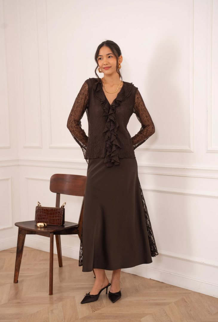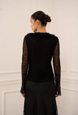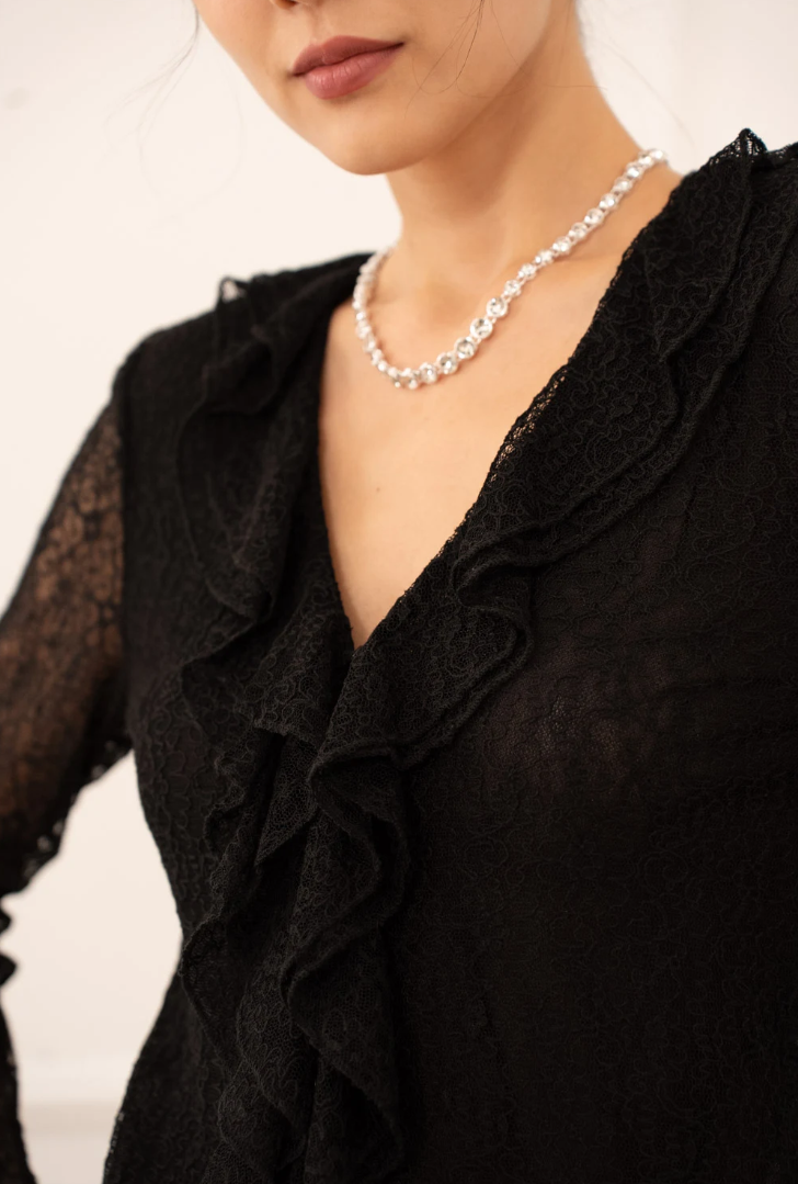 De lange mouwen van kant geven een elegante uitstraling, terwijl de licht uitlopende manchetten zorgen voor een verfijnd detail. De blouse heeft een aangesloten maar comfortabele pasvorm, waardoor hij zowel chic als draagbaar blijft—van avondgelegenheden tot stijlvolle diners.