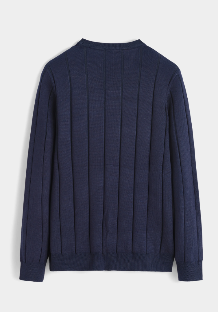 Deep navy blue — sharp, timeless, and quietly strong. The Oceaan Rib Sweater stands out through its wide vertical rib structure, adding length and subtle 3D texture to a refined silhouette.