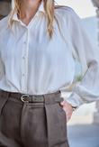 Tuck it loosely at the waist, leave the top button undone for a relaxed effect, and pair with pumps for evening — or with boots or sneakers for a modern city look.