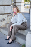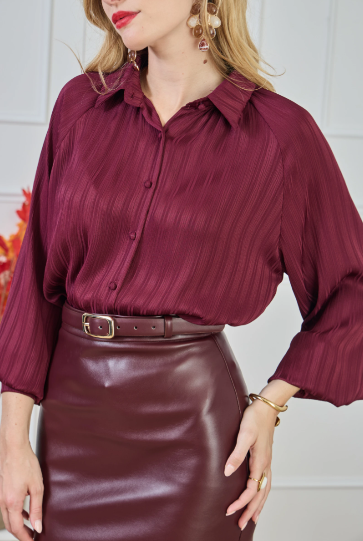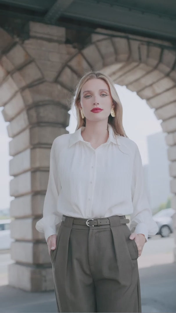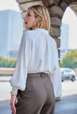 The blouse that softens every suit: airy, feminine, and crease-resistant.