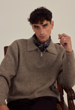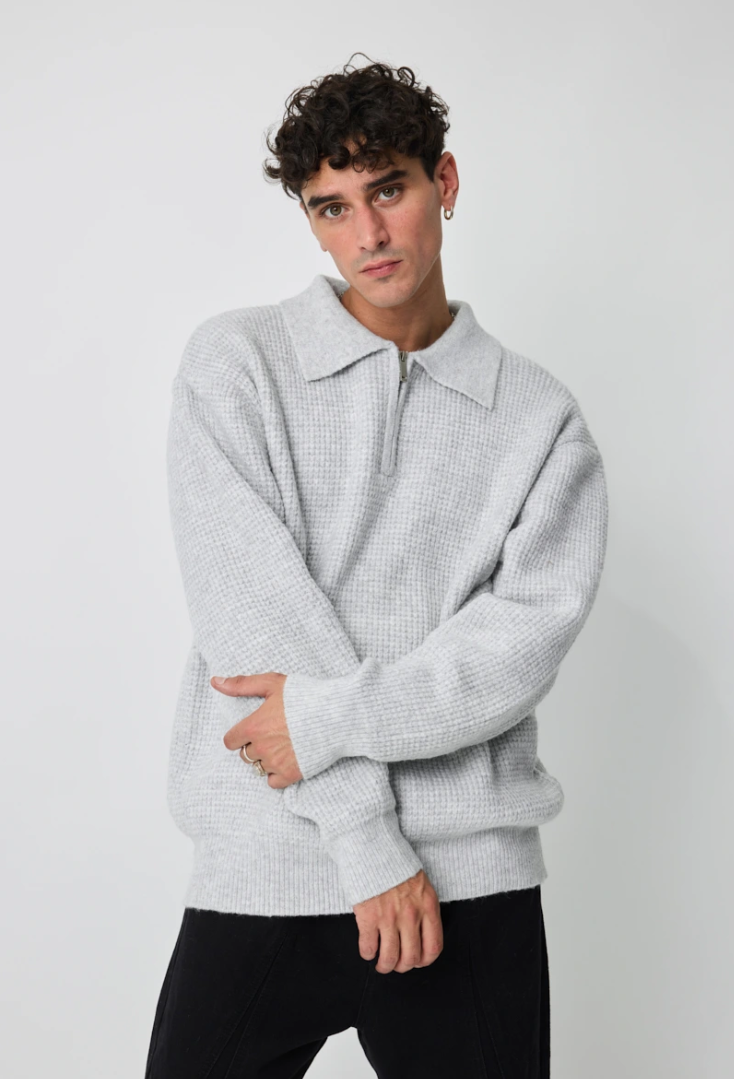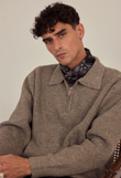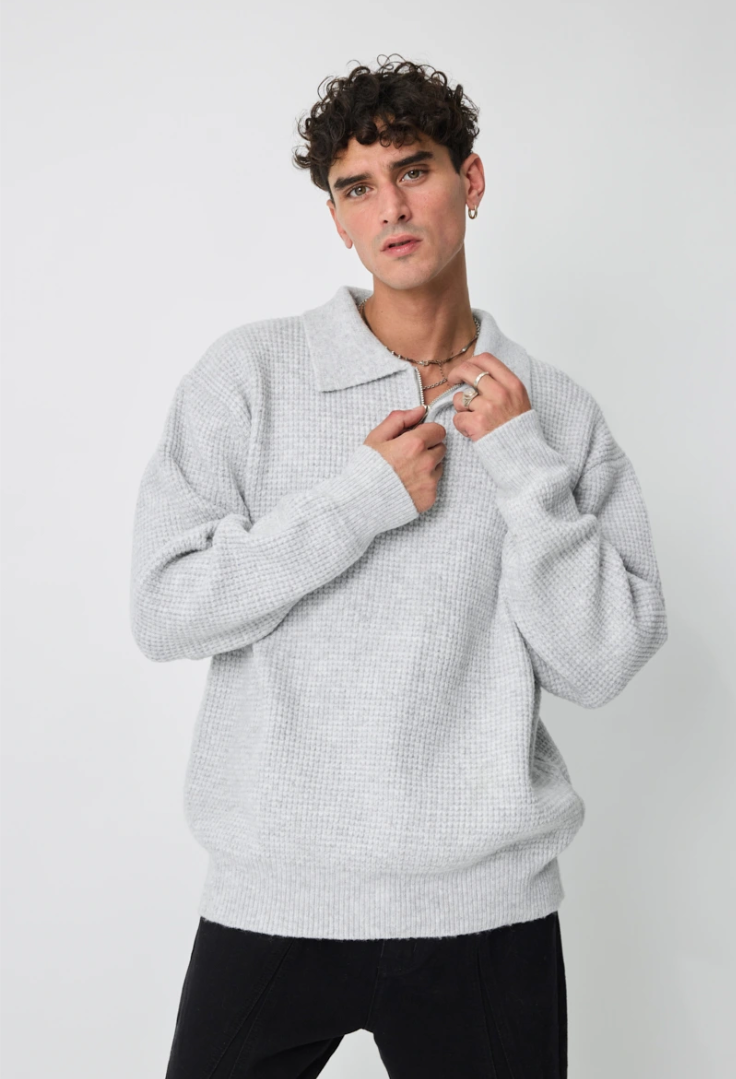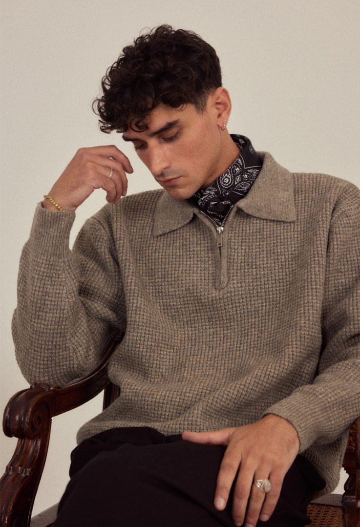 Waffle-knit men’s sweater with polo collar and half-zip detail. Crafted in a soft quadro morbido knit that traps warmth, adds airy volume, and feels richly textured. The relaxed fit with dropped shoulders falls straight and holds its shape — comfortable yet impeccably clean.