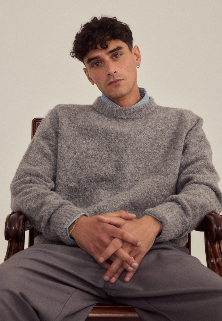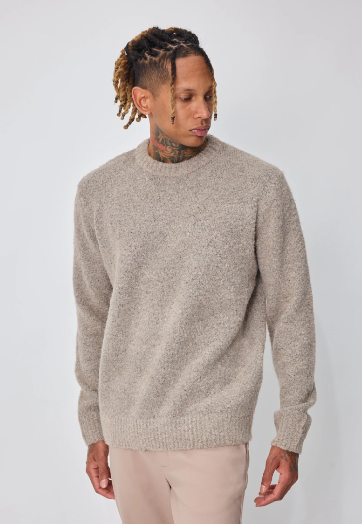 Soft, warm, and timeless — this bouclé knit in sand mélange adds instant texture and quiet depth to any look.